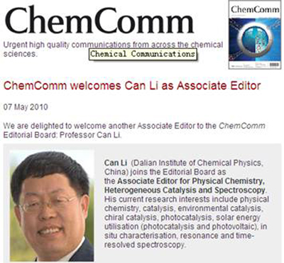 大连化物所李灿院士受英国皇家化学学会Chemical Communications主编Robert D. Eagling邀请出任该杂志副主编,具体负责物理化学、多相催化和光谱领域。