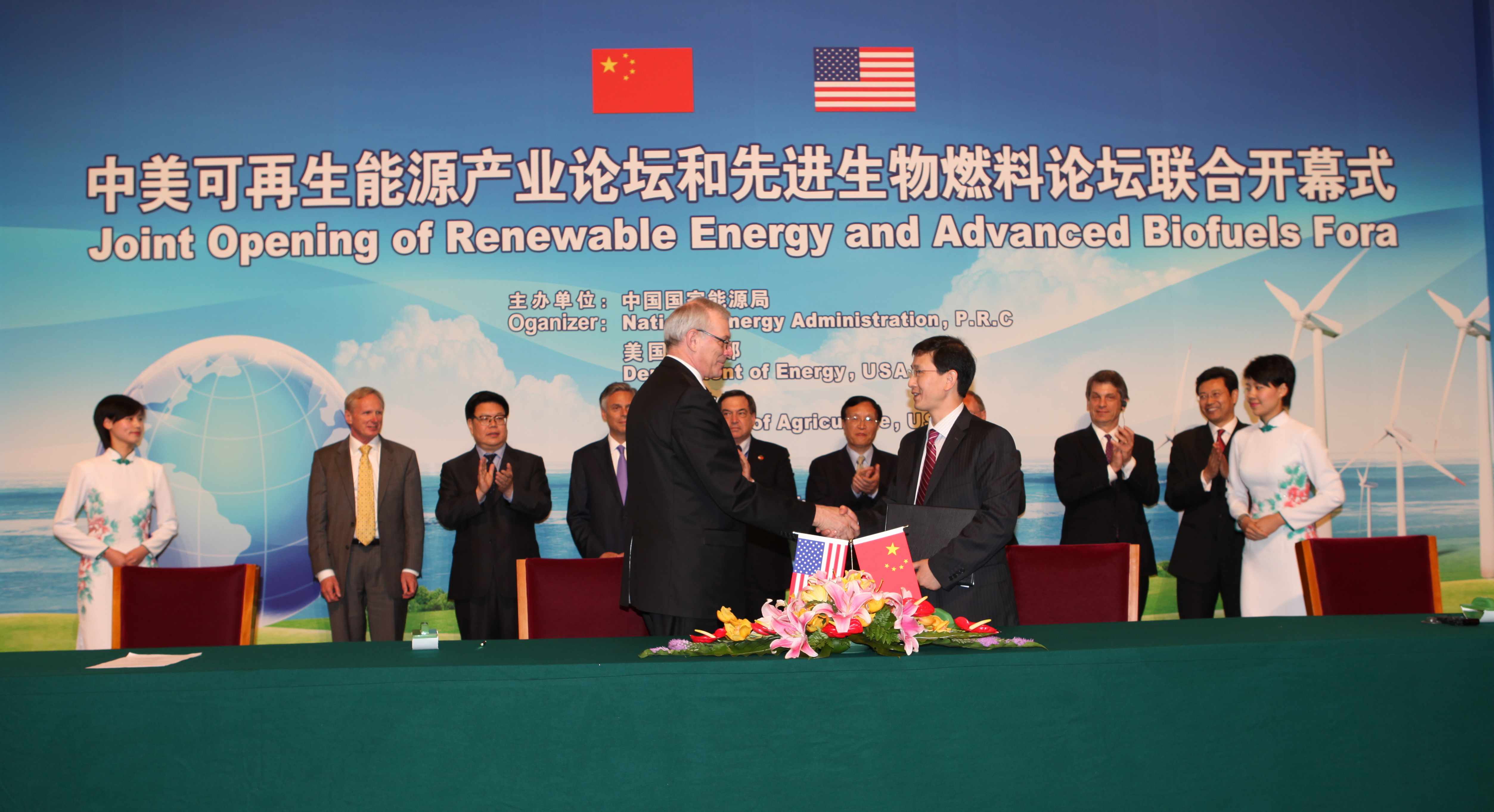 2009年11月17日,中国国家主席胡锦涛与美国总统奥巴马举进会谈并发布《中美联合声明》。中美双方签署了包括可再生能源等在内的三项谅解备忘录文件,计划就大规模利用风能、太阳能、先进生物燃料和现代电网进行合作。