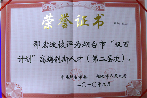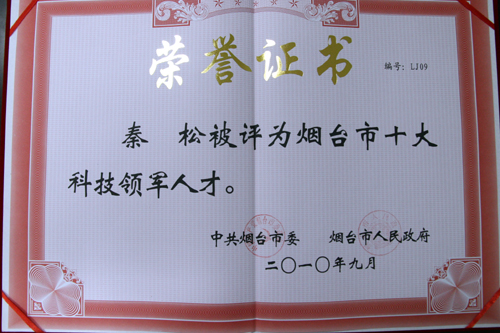 2010年9月3日,烟台市委、市政府在东山宾馆召开了2010年全市人才工作会议,会上表彰了烟台市科技杰出人才。其中,烟台海岸带研究所副所长秦松研究员被评为“烟台市十大科技领军人才”;邵宏波研究员被评为“烟台市‘双百计划’高端创新人才”。