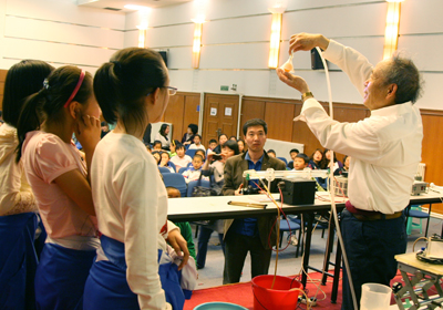 启动大会后,沙国河院士在礼堂做了题为《奇妙的科学实验——现场演示》的精彩的科普报告,报告深受欢迎,现场爆满,很多听众慕名而来。两场报告听众人数达400余名。参加报告会的中小学生们还亲自上台参与实验操作,来揭秘神奇的化学现象。在实验过程中,同学们充分体会到了科学实验的乐趣。
