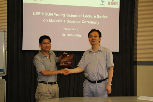 应金属所邀请,2011年度“李薰青年学者讲座奖”(Lee Hsun Young Scientist Lecture Series on Materials Science)获得者、美国纽约州立大学布法罗分校曾浩博士于7月6日至7月15日到金属所开展合作研究和学术交流。7月14日,曾浩博士进行了题为“磁性纳米结构”的专题报告,报告会上,张志东研究员为曾浩博士颁发“李薰青年学者讲座奖”奖牌。