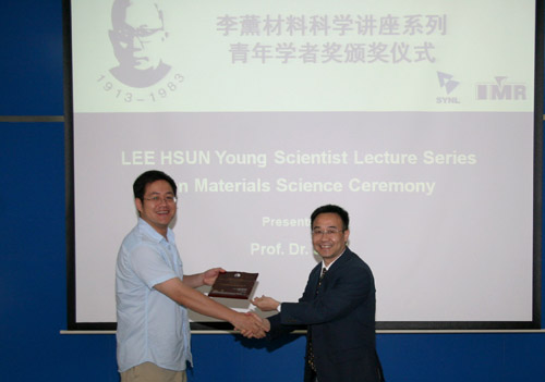 来访期间,李巨教授作了题为“Plumber's Wonderland Found on Graphene”的精彩学术报告,介绍了他们组与美国Sandia国家实验室黄建宇(1996年于金属所获博士学位)组合作,结合原子模拟和电子显微学研究对石墨烯的微观结构进行剪裁的研究结果,生动阐述了计算模拟方法与手段在揭示实验现象本质和启发新材料研究思路方面的不可替代的作用。李巨教授的报告引起与会的金属所研究人员和研究生的浓厚兴趣,双方在报告讨论阶段进行了热烈的交流。报告前,金属所杨锐副所长为李巨教授颁发了李薰青年学者奖奖牌。来访期间,李巨还参加了我所主办的“材料电子显微学国际学术研讨会暨第四届郭可信电子显微学与晶体学暑期班”,并与钛合金研究部徐东生研究组和工程合金研究部郝玉琳研究组分别针对材料变形计算模拟和Ti2448合金变形行为进行了交流。