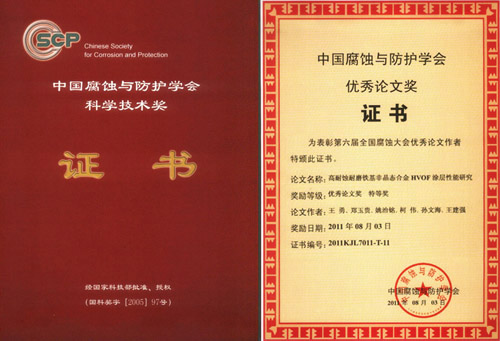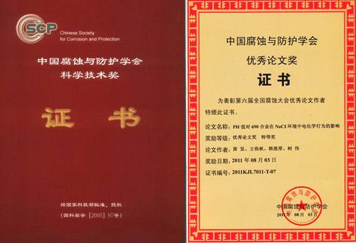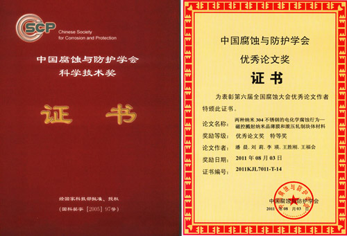 另外,会议期间还举行了中国腐蚀与防护学会优秀论文奖的颁奖仪式。中国腐蚀与防护学会优秀论文奖是中国腐蚀与防护学会科学技术奖中的一个奖项。2005年中国腐蚀与防护学会在国家科学技术奖励工作办公室注册登记了科学技术奖(国科奖字[2005]97号文,登记证书编号:国科奖社证字第0138号),下设科技发明奖、科技进步奖、优秀论文奖和国际科学技术合作奖等4个奖项。自2007年启动科技进步奖以来,本次是首次启动优秀论文奖。本次大会共收到学术论文摘要350余篇,论文全文280余篇,经同行专家认真筛选和评审,评选出优秀论文45篇,其中特等奖15篇,一等奖30篇。其中,金属所6篇论文榜上有名,3篇论文获优秀论文特等奖,3篇论文获优秀论文一等奖。
