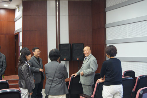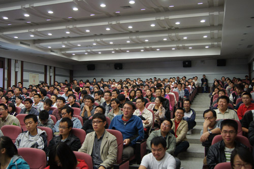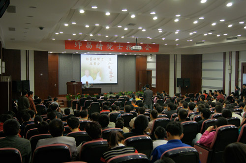 报告会开始时间为上午10时,距离报告开始还有半个小时,就有大批的同学陆续来到报告厅,很快能容纳400人的报告厅就变得座无虚席。当师先生在研究生部刘敏主任的陪同下走入会场时,全场爆发出热烈的掌声。师先生带着慈祥微笑,向大家频频挥手。师先生刚刚落座,就有同学拿出事先准备好的师先生自传《在人生道路上》,请师先生签名留念。报告会现场充满了热烈而温馨的气氛。