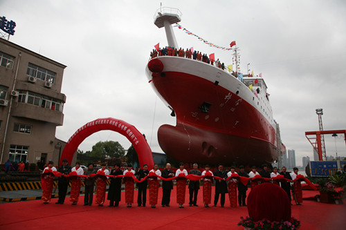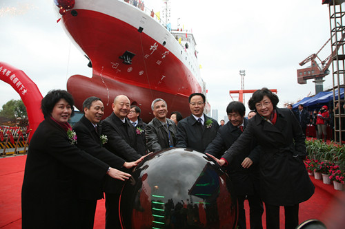 丁仲礼、孙伟、田承忠、李国安、刘艳荣、王延觉、孙群、张惠、孙松、黄瞿记等领导为海洋科学综合考察船下水剪彩。丁仲礼、孙伟、田承忠、李国安、刘艳荣、王延觉、张惠触摸“水晶球”启动下水指令,中国科学院副院长丁仲礼为海洋科学综合考察船下水行“掷瓶礼”,并宣布“国家重大科技基础设施—海洋科学综合考察船下水开始”,仪式现场礼炮齐鸣,威武的“科学”号在众人瞩目下缓缓从船台滑下驶入长江。