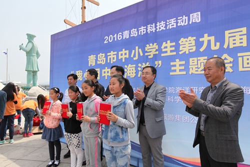 由青岛市教育局、青岛市科技局、中国科学院海洋研究所、中国海洋湖沼学会共同主办,青岛市少年科学院承办的第九届青岛市中、小学生“我心目中的海洋”主题绘画活动在青岛银海大世界成功举办。本届绘画活动首次通过网络、微信等平台征集作品,吸引了全市242所学校的7906名中小学生积极参与,由专业美术老师评选出一二三等奖。14日上午,邀请到100名获奖同学到现场作画,在百米长卷上挥毫泼墨,用五彩缤纷的画笔描绘出同学们心目中的海洋世界。青岛市科协主席胡辛、海洋所党委书记王凡等领导为获奖同学颁奖。