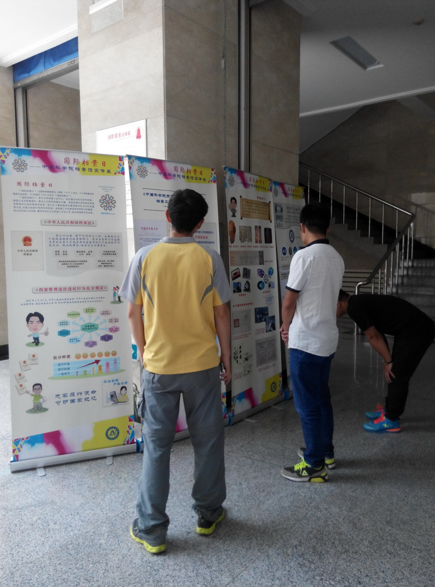此次活动主要通过档案知识展板形式展开,展出内容包括《中华人民共和国档案法》、《档案管理违法违纪行为处分规定》、《中国科学院关于加强和改进新形势下档案工作的实施意见》、《中国科学院院属单位档案工作管理体系图》,以及档案内涵、种类、中国科学院档案馆概况及档案精品等,图文并茂的展板吸引了职工和研究生纷纷驻足观看学习。