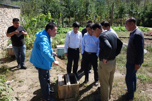 在荒地村的农户家中,沈阳生态所派驻的科技扶贫干部许思明同志向工作小组展示了科技扶贫重点项目“中华蜂的驯化养殖”实施效果。据了解,目前该项目在当地农户家的推广情况和效益很好。另一扶贫项目“果树和林下经济作物种植”科技示范基地也展示了良好的发展势头,即将向村民推广。