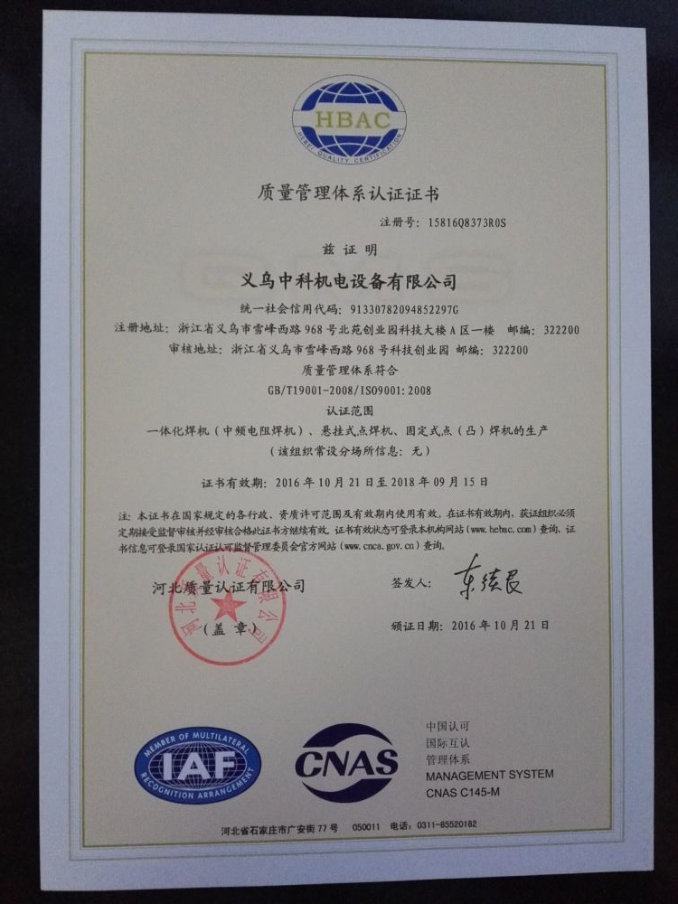 ISO9001标准是国际标准化组织(ISO)颁布的在全世界范围内通用的关于质量管理和质量保证方面的系列标准。该系列标准目前已被90多个国家等同或等效采用,是全世界最通用的国际标准。清晰的流程,高效化的管理和经验,多年来脚踏实地坚持不懈的努力,是义乌中科机电设备有限公司获得市场及国际权威审核机构SGS认可的关键因素。此次获得ISO9001服务认证证书,表明公司获得了国际肯定。