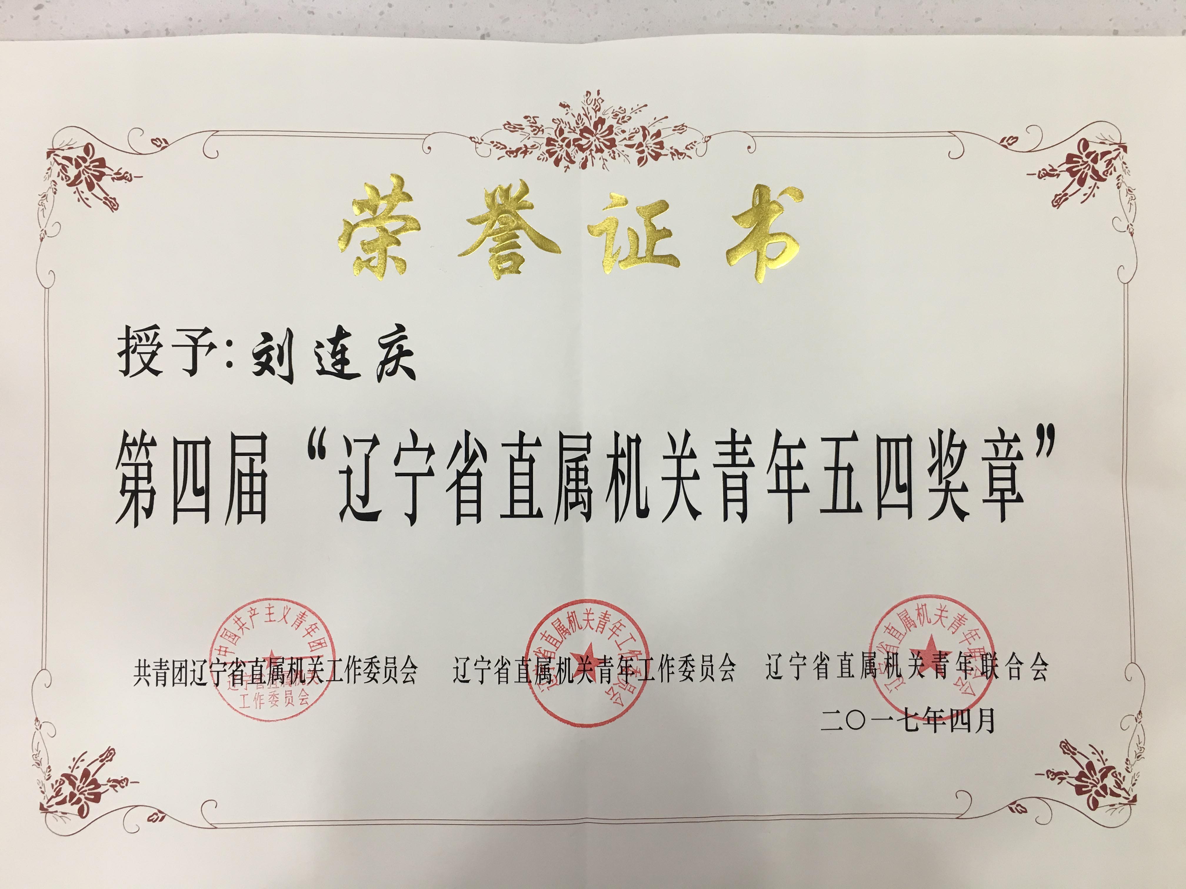 刘连庆获评辽宁省直机关青年五四奖章