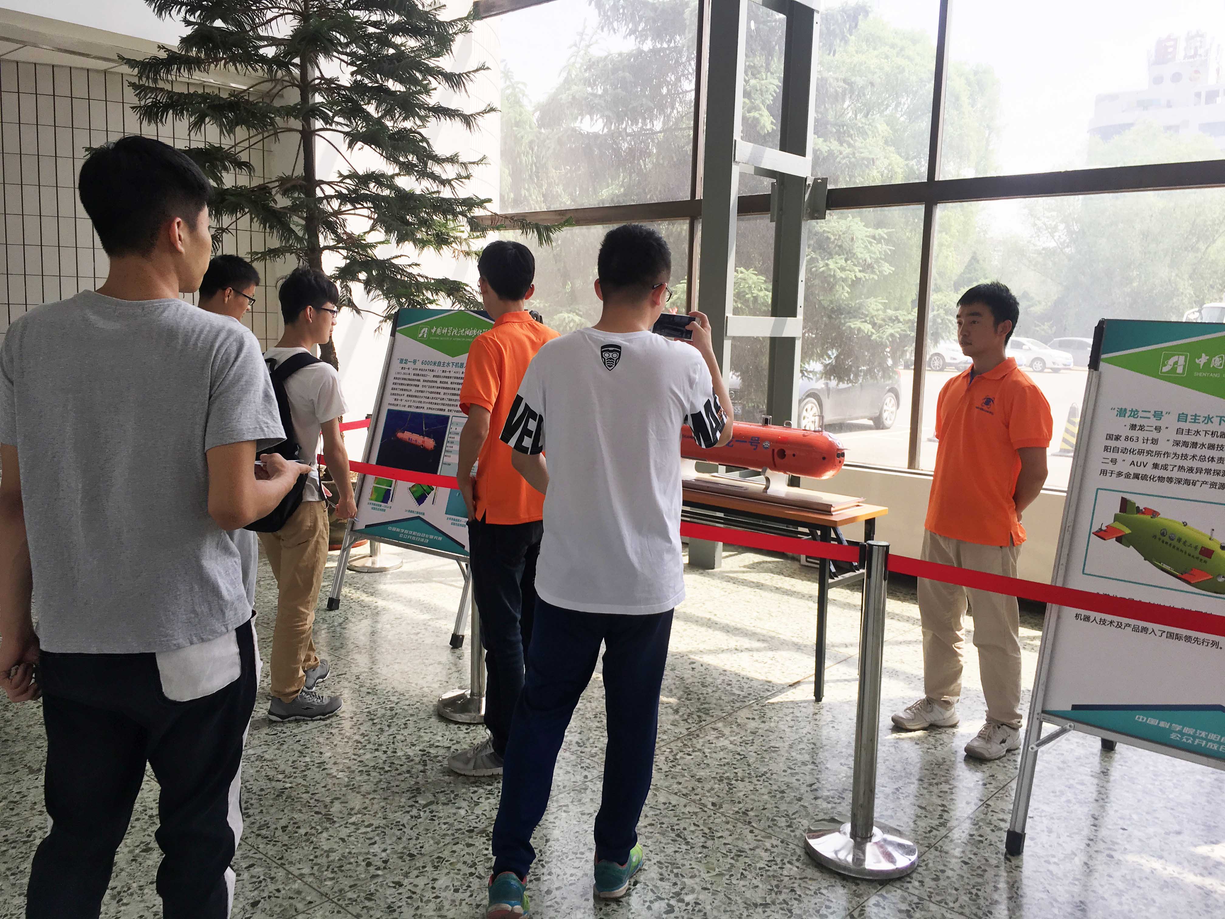 沈阳自动化所机器人、光电信息技术和智能制造三个学科方向代表性成果均在活动中与社会公众见面。在R楼一楼“机器人展区”,“潜龙一号”AUV、“潜龙二号”AUV、“海斗”号自主水下机器人、“海翼”号水下滑翔机、“龙珠”号ROV和“探索100”小型自主水下机器人的实物或模型亮相;光电信息技术、智能制造技术和微纳米机器人等成果通过展板向观众进行了展示。在A楼,开放了研究所科技成果展馆,并“邀请”到了新松公司“松果”服务机器人与观众进行互动。