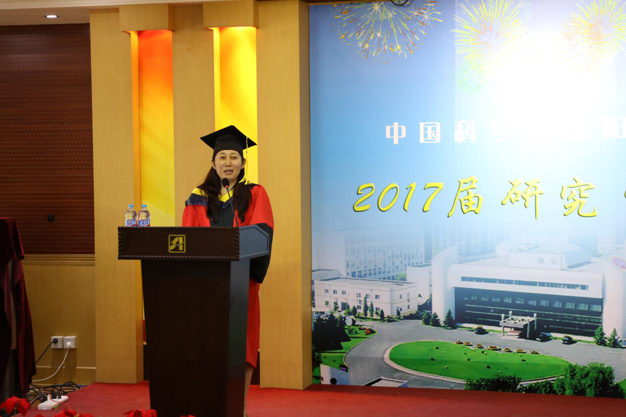 随后,博士生许驰代表毕业生发言。他由衷地感谢为学生的成长辛苦耕耘的导师们,表达了对同学、朋友的不舍之情,以及即将踏入社会的激动而不平静的心情。梁炜研究员作为导师代表发言,她对即将踏上新的人生征程的毕业生们提出了三点希望:立德、感恩、爱自己。