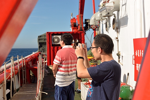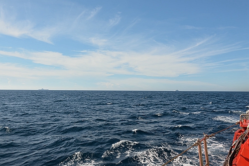 明天即将到达作业海域,下午四点左右,每个人都在紧张的为设备做最后的检查和调试,突然广播里传来一声惊喜的呼喊:“快看!右舷!我们自己的航母!”惊喜,兴奋,如涟漪一般迅速在原本平静的船舱漫延。大家纷纷暂停手上的工作,来到右舷眺望,辽宁舰巨大的身影傲然映入眼帘。高耸的舰桥、微微翘起的飞行甲板展示着它的身份和地位,视野中两艘属舰环绕护卫航行,组成了一个庞大的航母编队。这一刻,“辽宁”号带给我们的自豪和安全感笼罩着整个海面。