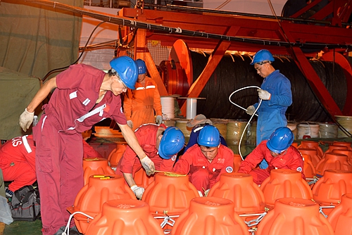 灯光下准备有线实时化潜标布放