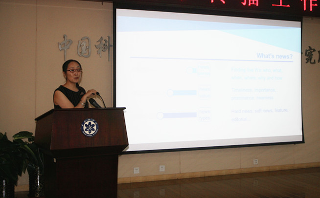 陈娜作了题为"On Science News Writing"的报告,以研究所科研进展英文宣传稿为例,详细介绍了英文宣传稿写作方式和要求,现场指导科研人员如何运用倒金字塔的写作技巧写出重点突出、简洁明了、吸引受众“眼球”的新闻稿。