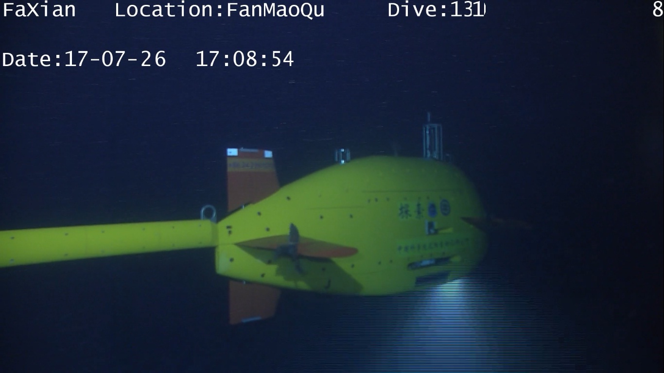 在前期工作的基础上,本航段还同步实现了多台探测设备的协同探测与作业及交汇拍摄。首先布放“探索”号AUV入水,在冷泉区预定水域进行光学探测作业;随后,“科学”号科考船前往另一作业水域,布放“发现”号ROV入水,利用搭载在ROV平台上的拉曼光谱探测系统对海底冷泉区天然气水合物、冷泉生物群落和沉积物孔隙水等进行原位和定量分析。在“探索”号AUV完成指定区域的调查任务后,自主航行至“科学”号科考船作业区域。在“科学”船和“发现”号ROV的精准协同配合下,让科学家第一次看到了AUV在海底的工作状态,在我国首次实现了两种不同类型的水下机器人近距离交汇拍摄。