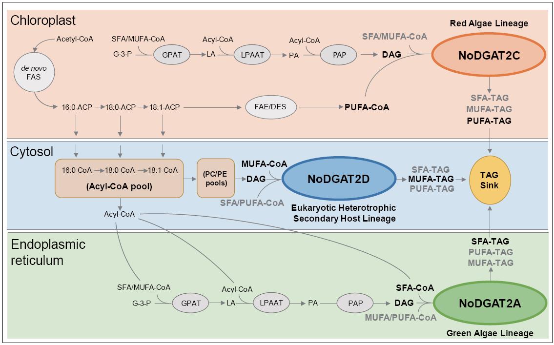 单细胞中心等前期发现,在海洋微拟球藻基因组中编码有多达11个II型二酰甘油?;泼副嗦牖颍?/span>DGAT2),它们催化甘油三酯合成中的最后一步也是关键一步。动物和高等植物中常常只有1-2个DGAT2,为何海洋微拟球藻具有超出已知所有物种的DGAT2家庭成员数目呢?为了解答上述问题,研究人员通过在酵母中的表达与功能分析、在体外的酶活鉴定、进而在微拟球藻中的过表达与基因敲低等层层深入的实验策略,发现其中DGAT2A、DGAT2D与DGAT2C 具有TAG合成酶活性,而且这三个DGAT2家庭成员分别偏好饱和、单不饱和和多不饱和的脂酰CoA底物?;诖耍芯咳嗽碧岢隽吮惹捌诠ぷ鳎?/span>Li, et al, Plant Cell, 2014)深入了一大步的油脂合成机制模型,认为其中分别来自于三个不同祖先的DGAT2A、DGAT2D与DGAT2C,在长期的共进化过程中,形成了迥异却互补的底物偏好性,而且在TAG合成的流水线上进行着精妙的功能分工与时空协作(图一)。