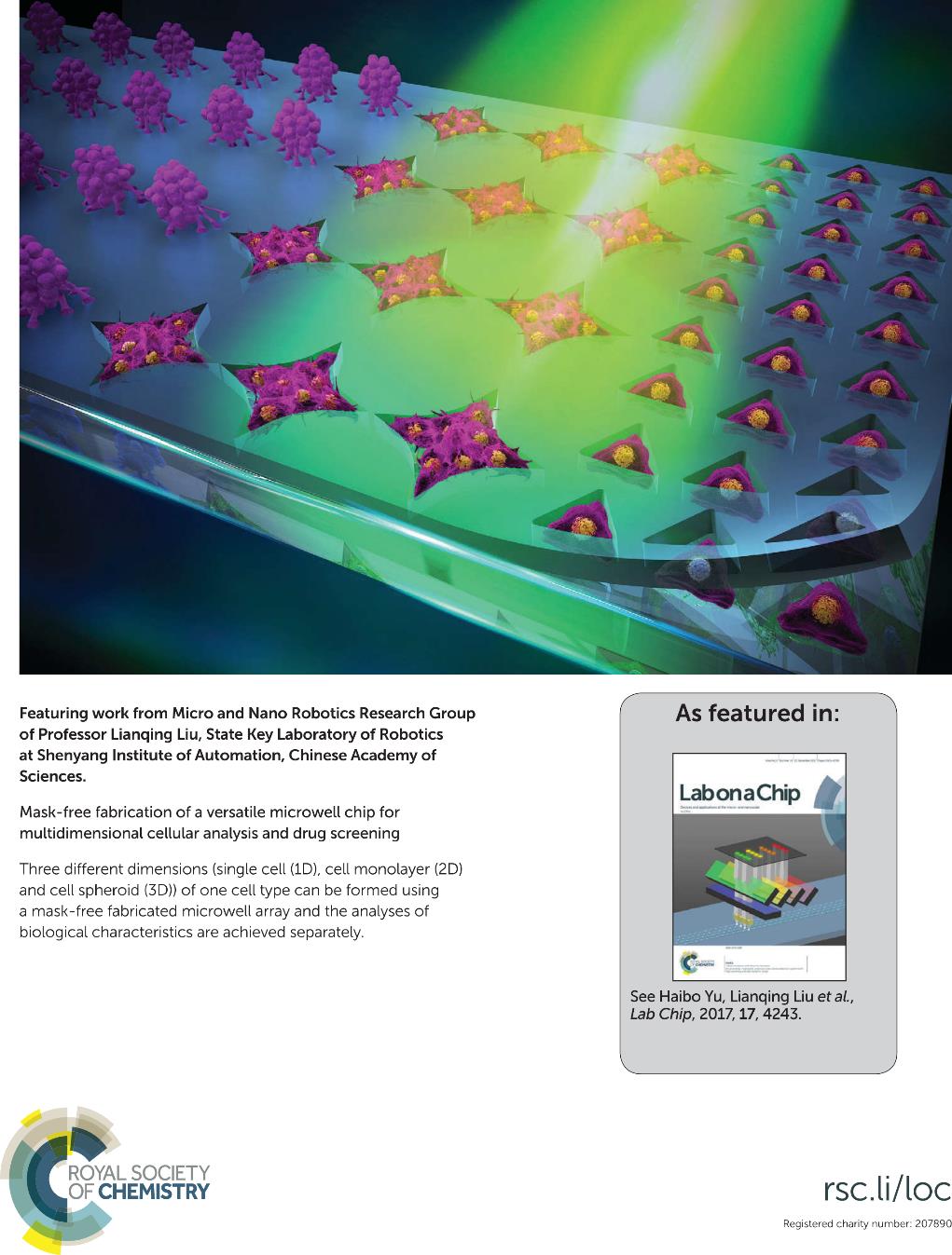 近日,国际著名学术期刊Lab on a Chip(中科院一区TOP类期刊,影响因子6.045)以outside back cover的形式刊载了中国科学院沈阳自动化研究所微纳米课题组利用机器人化的微纳操控和组装技术在多维细胞装配领域的最新研究成果——Mask-free fabrication of a versatile microwell chip for multidimensional cellular analysis and drug screening。