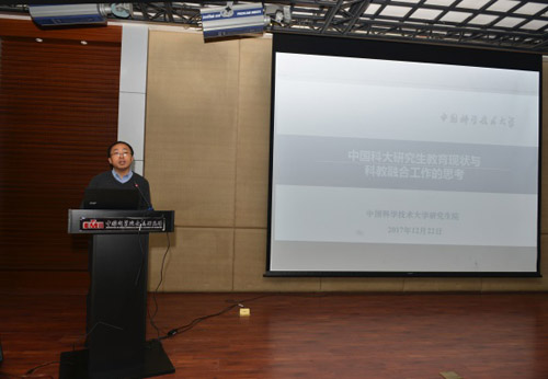 中科大研究生院吴恒安副院长作了题为“中国科大研究生教育现状与科教融合工作的思考”的报告。他介绍了学??平倘诤系淖钚戮?,报告从学科建设、招生选拔、教学培养、奖助体系、学位工作、导师队伍、培养质量、科教融合学院建设与发展八个方面具体展开。报告内容丰富、详实,在科教融合实施过程中具有很强的指导意义。吴院长还就一些管理细节例如对学校制定的学位申请成果新要求等进行了详细解读。报告的最后,吴院长热忱欢迎金属所各位导师莅临中科大,共商事业、共谋发展,将科教融合学院越办越好!