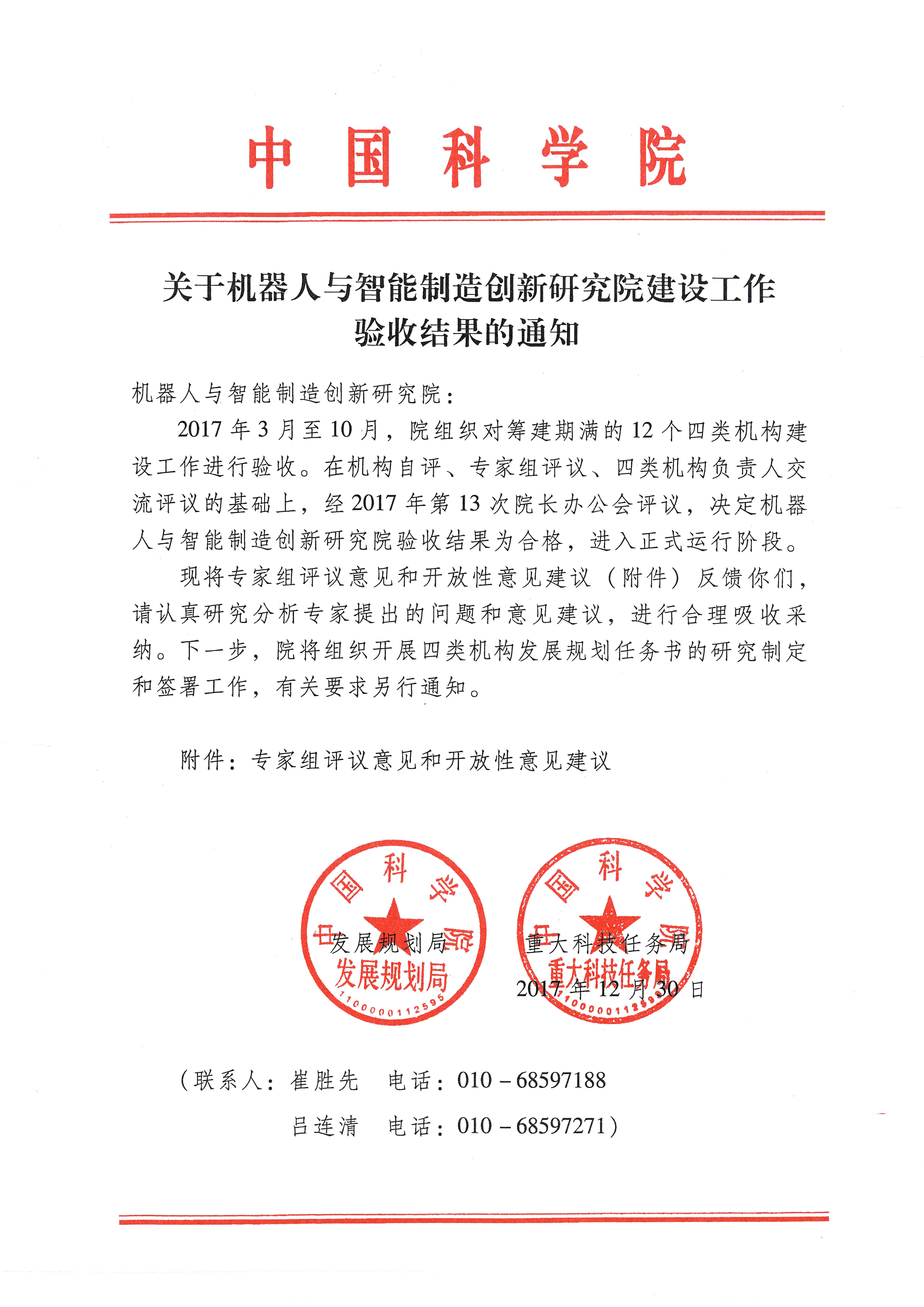 2017年10月11日,中国科学院机器人与智能制造创新研究院建设试点工作专家组验收会举行,筹建组组长于海斌汇报了创新研究院筹建工作情况。中科院副院长相里斌在验收会上指出“创新研究院定位准确,领域方向布局合理?;魅舜葱略喝嫱瓿沙锝ㄆ谀勘辍?。近日,经院长办公会评议,决定创新研究院通过验收,进入正式运行阶段。