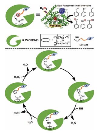 图1.双功能小分子驱动的P450过加氧酶和推测的催化机理