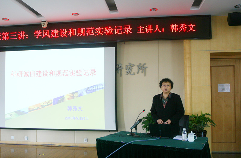 为推进研究所科研学风道德建设,提升研究生导师能力,进一步塑造研究所风清气正的创新文化氛围, 5月23日研究所组织“清源聚能”文化论坛第三讲暨2018年度导师培训第四讲,大连化物所咨询委员会委员韩秀文研究员应邀做了主题为“学风建设和规范实验记录”的报告。所领导、研究组组长、副研究员以上科研骨干、博士后、管理支撑部门职工和学生一百多人到场聆听了报告会?;嵋橛傻澄笔榧欠氚I鞒?。