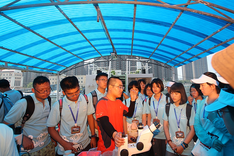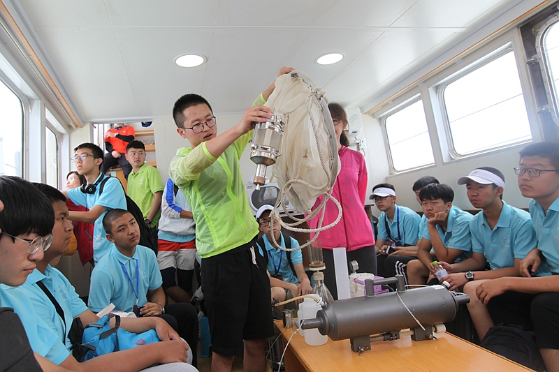 海上科学考察实践活动共分四个板块,分别是乘坐“创新”号科考船进行海上调查作业,在码头??康摹昂E浮焙趴瓶即峡垢∮沃参镉敫挥?、浮游动物与海洋生态系统食物链、食物网以及海洋污损生物知识讲解。