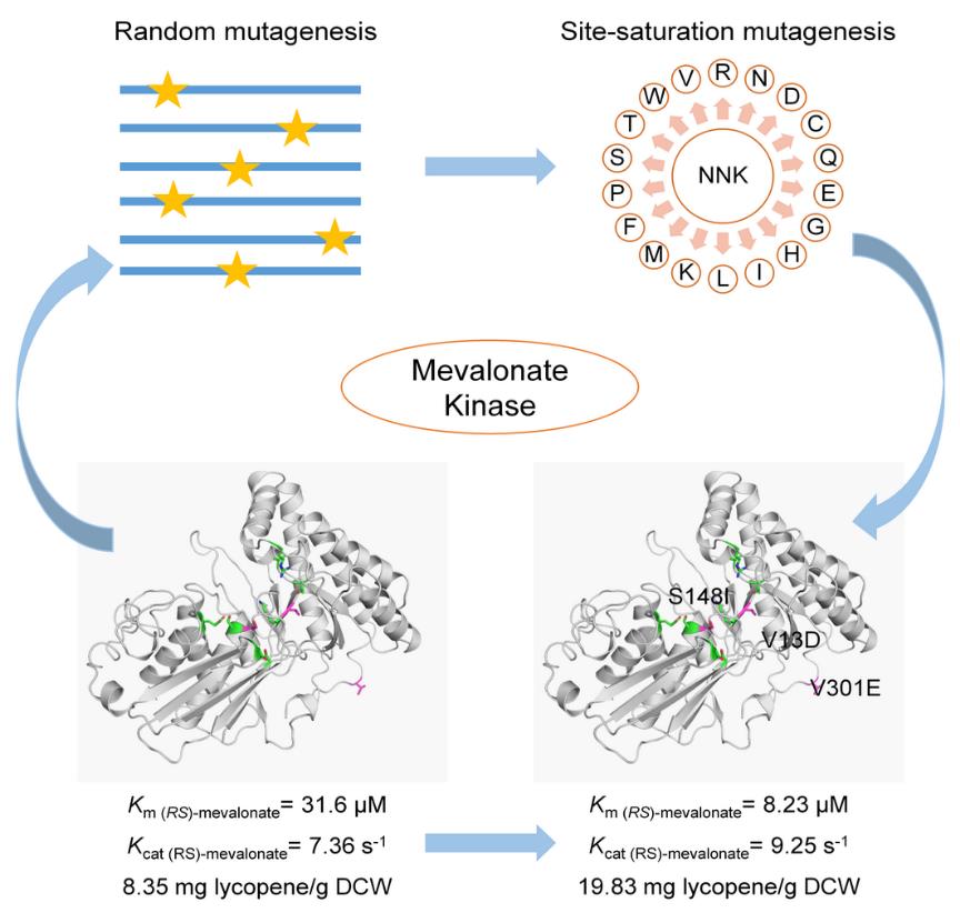 图1. 代谢限制性位点MK的定向进化策略和效果图