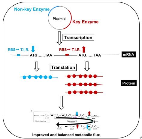 青岛能源所生物基材料组群张海波研究员带领的精细化学品研究组长期致力于萜烯化合物的生物合成,重点针对MVA途径的酶甲羟戊酸激酶(MK)、异戊烯焦磷酸异构酶(IDI)和萜烯合成酶等几个限制性点,同时统筹代谢流和中间产物毒性,平衡整条合成路线,在点线结合提升萜类化合物合成的MVA途径的效率上取得了新的突破。首先,针对MVA途径中的MK和IDI,通过不同物种来源筛选、随机突变和半理性设计进行定向进化和优化,获得了酶活性提高的MK(RSC Advances, 2018)和IDI (Microbial Cell Factories, 2018),从而减弱代谢流在MK和IDI位点的阻滞,最终提高萜烯化合物的产量(图1 MK的定向进化策略和效果图)。其次,统筹MVA途径涉及到的多步反应,对酶表达量的调控涉及的多个水平。该研究选取翻译水平上的调控方法,避免了RNA的不稳定和翻译后水平调控的菌体代谢负担问题,通过调整不同酶的核糖体结合位点(RBS)序列的手段,调控不同酶的表达,平衡整条代谢路线。对非限制酶羟甲基戊二酰辅酶A还原酶基因(MvaE)和甲羟戊酸焦磷酸脱羧酶基因(ERG19),调节其RBS序列,使其翻译起始效率(T.I.R.)降低,降低其蛋白表达量。对限制性酶MK和IDI,调节其RBS序列,使其T.I.R.提高,提高其蛋白表达量。通过对甲羟戊酸途径中的不同的酶的蛋白表达量的调控,实现了代谢流的平衡,最终提高了萜烯化合物的产量(图2 非限制酶和限制酶RBS序列优化策略)。
