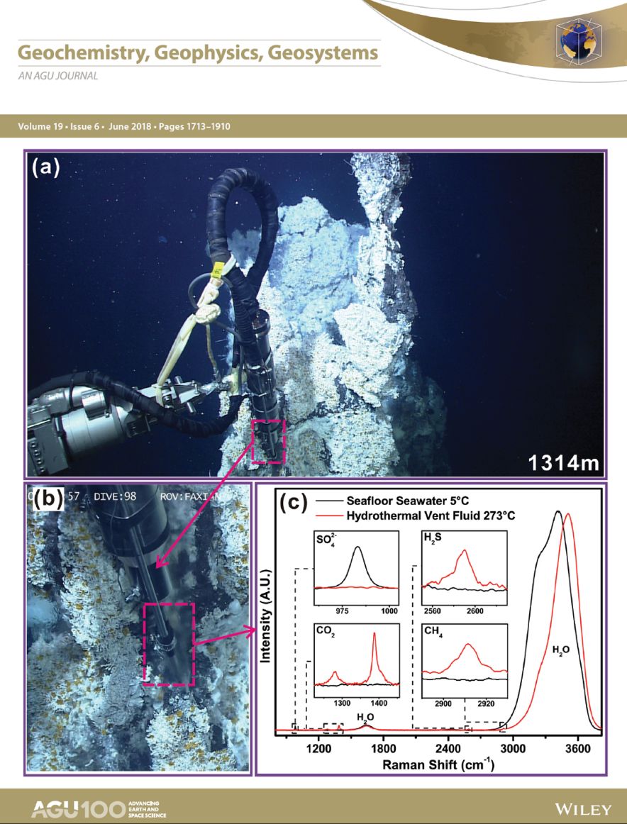 近日,国际地学期刊Geochemistry, Geophysics, Geosystems以封面研究论文形式刊发了中国科学院海洋大科学研究中心阎军研究员团队、李超伦研究员团队在深海热液系统原位拉曼光谱定量探测方面的最新成果。团队基于自主研发的深海原位激光拉曼光谱探测系统(Raman insertion probe-RiP)对冲绳海槽中部热液区的高温热液流体进行原位拉曼光谱定量探测,在国际上首次获得高温热液流体中溶解二氧化碳及硫酸根离子的原位浓度。