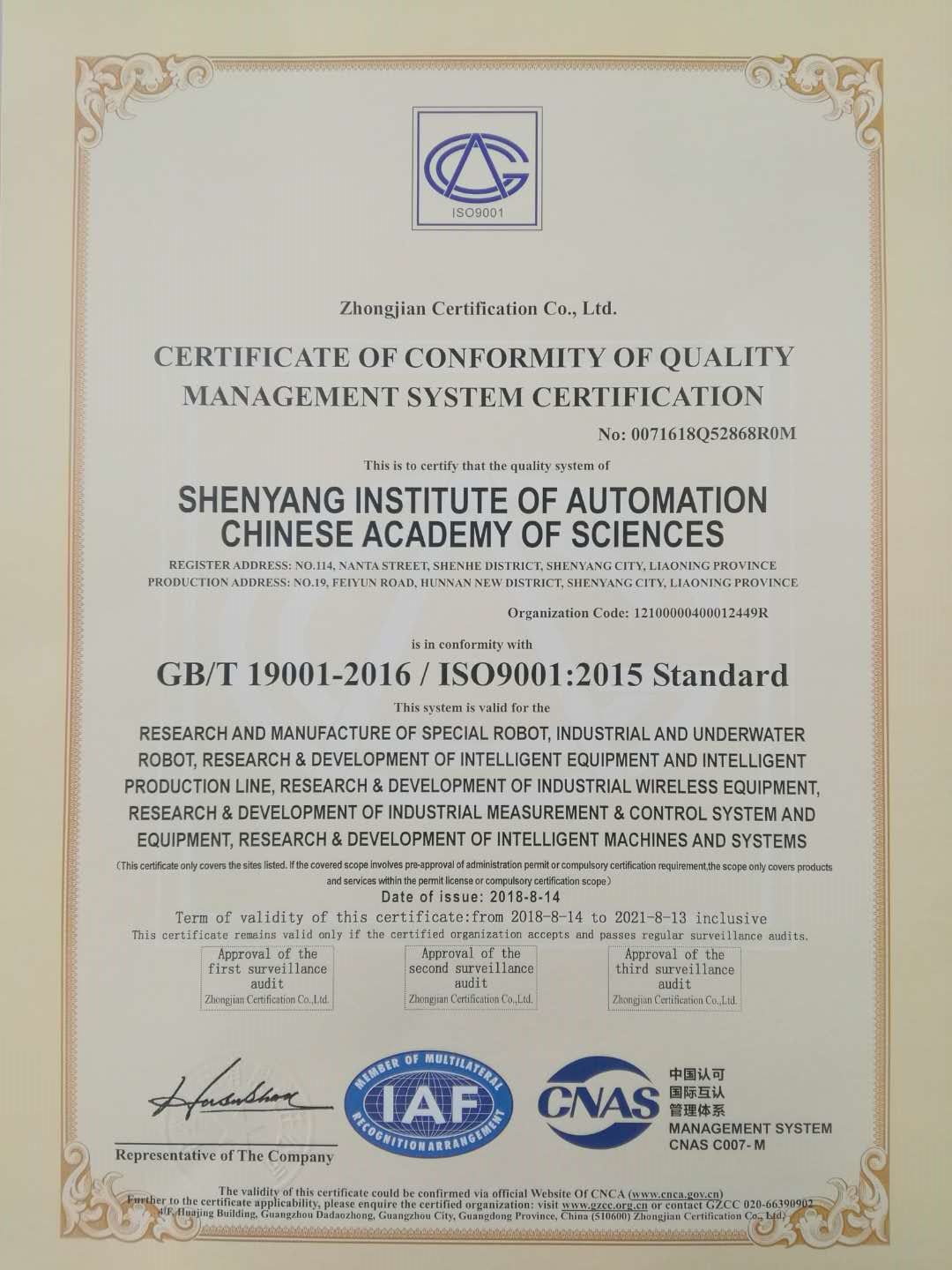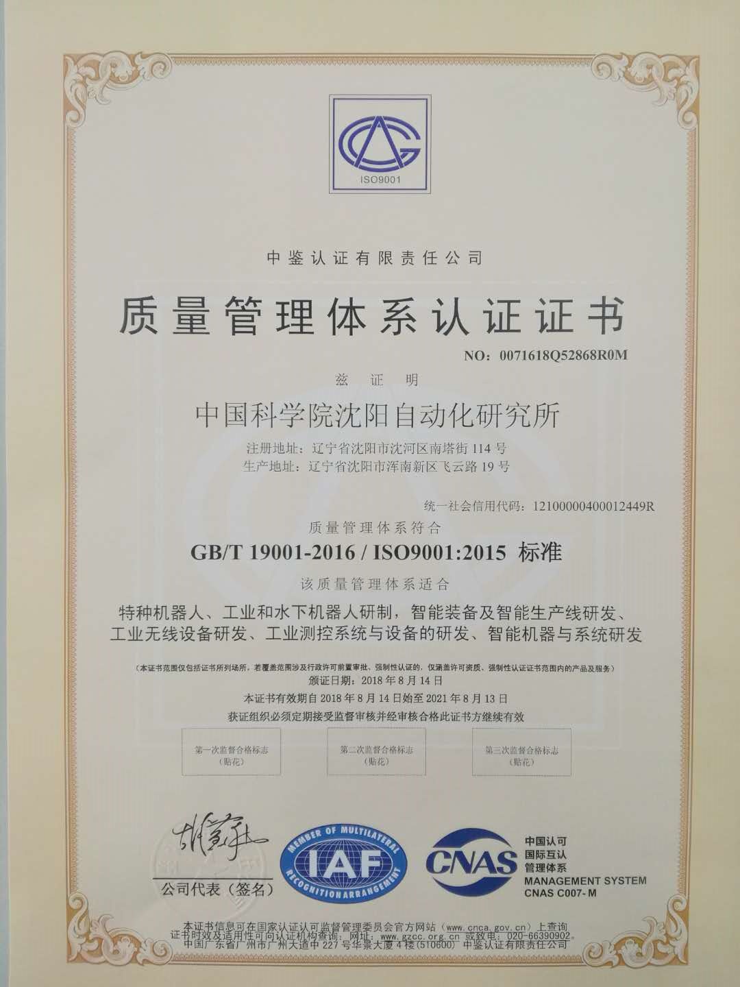 近日,中国科学院沈阳自动化研究所取得了中鉴认证颁发的GB/T19001-2016/ISO9001:2015标准质量管理体系证书,认证范围包括特种机器人、工业和水下机器人的研制,智能装备及智能生产线、工业无线设备、工业测控系统与设备、智能机器与系统的研发,认证范围基本扩展到研究所《事业单位法人证书》全部业务范围。