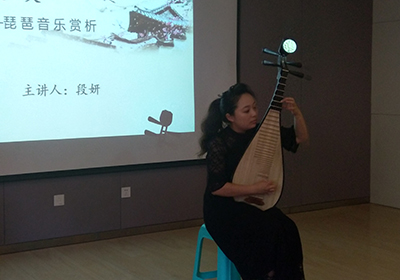 段妍首先对琵琶的构造原理和历史演变进行了解析和阐释,让大家了解到琵琶作为一种传统乐器在中国民乐中的文化地位;接下来,她简要介绍了琵琶丰富且风格各异的演奏技巧,并分别进行了演示;随后,她且弹且谈,和她的学生先后演奏了《春雨》《龙船》《虚籁》《十面埋伏》等琵琶名曲,通过对作品和其中演奏手法的讲解,带领大家感受乐曲的意境。全场报告会中,报告者精湛的演奏、丰沛的才情和极强的音乐表现力感染了听众,直到报告结束,大家还久久沉浸在琵琶优美的旋律之中。