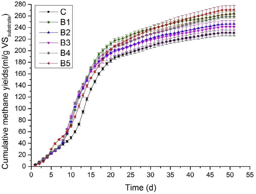 图1微生物-微氧预处理玉米秸秆累积产甲烷量(B5)