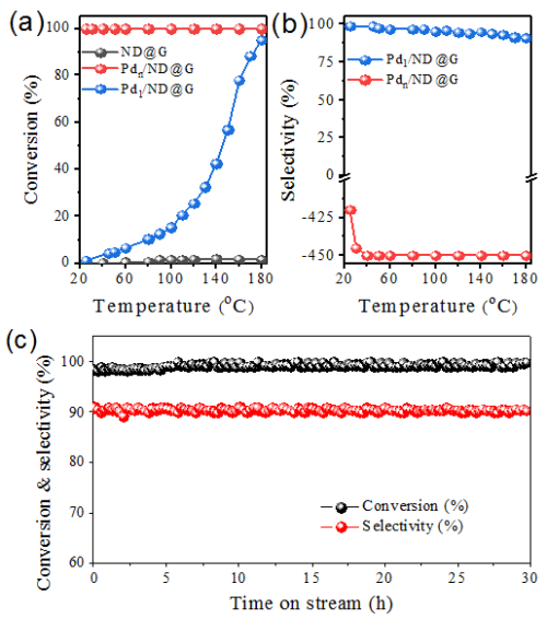 图 1 催化剂Pdn/ND@G和Pd1/ND@G乙炔加氢反应随温度转化率(a),选择性(b)及Pd1/ND@G在180oC催化稳定性(反应条件:1% 乙炔, 10% 氢气, 20% 乙烯混合气,氦气平衡; 空速(GHSV) = 60000 h-1)