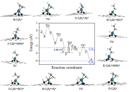 刘洪阳副研究员带领的研究小组致力于新型纳米碳材料负载金属催化剂的研究。经过多年的学术积累,首次利用纳米金刚石/石墨烯复合核壳材料(ND@G)为载体,制备出一种原子级分散高选择性乙炔加氢Pd基催化剂(图1)。通过球差电镜表征(图2)并结合X射线吸收谱表征(图3),证实了Pd在碳载体上的原子级分散形式以及局域配位环境中的电子结构和化学成键。考虑到实际反应体系中氢的参与和结构的稳定性,他们构建了Pd原子与碳载体三配位成键的结构模型,研究了乙炔在此位点的氢化反应机制。利用密度泛函理论(DFT)模拟计算表明,具有单原子Pd活性位点的催化剂,在乙炔氢化反应中,更有利于反应产物乙烯的脱附,进而抑制乙烯进一步加氢反应的进行(图4)。该项研究为开发新型高效选择性加氢催化剂提供了新思路。