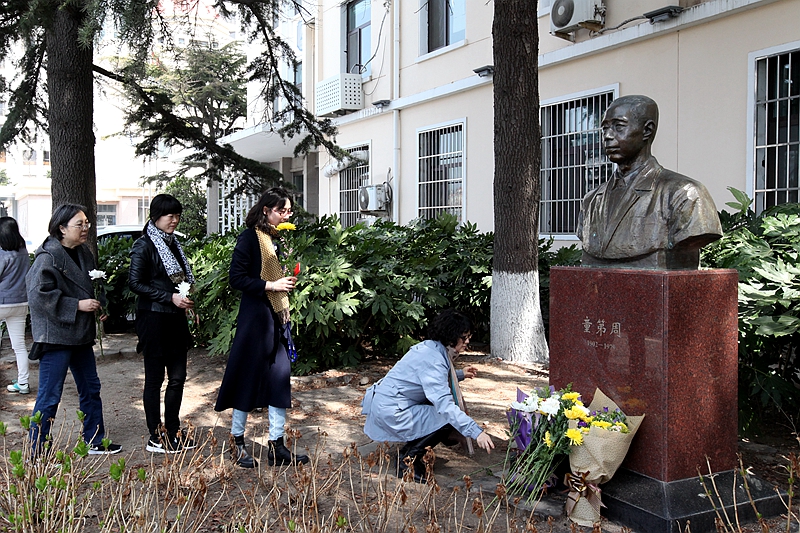 王辉书记、毕伟副书记向童第周先生铜像献花