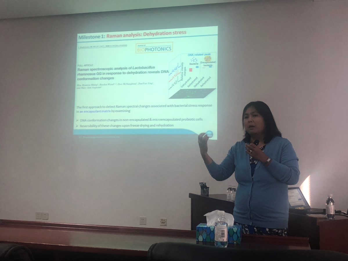 此次交流访问的重点是研究所单细胞中心团队自主研发的单细胞拉曼分选仪。在与单细胞中心的座谈会上,Netsanet首先介绍了CSIRO的基本情况和农业与食品部的重点研究方向,Mya Myintzu Hlaing博士做了题为“Characterisation of the molecular composition and impact of stresses on bacterial cells using vibrational spectroscopy combined with transcriptomic analysis”的学术报告。Myintzu详细介绍了利用光谱学和转录组学相结合的方法研究在农业与食品加工领域检测细菌细胞的分子组成和压力应激情况的研究工作,并与现场参会人员就实验的细节与关键点进行了深入的讨论。单细胞中心研究员马波介绍了单细胞拉曼分选仪如何在单细胞水平实现非标记式拉曼表型识别与功能分选,如何为单细胞生物学研究提供崭新的整体解决方案,以及该仪器在农业、食品、发酵领域的应用前景。随后,Netsanet一行重点参观了单细胞中心的科研平台和自主研发仪器?;谠诶觳夥矫嫜芯砍晒姆窒砗蜕钊肓私?,双方就下一步开展合作研究与联合申请项目达成共识。