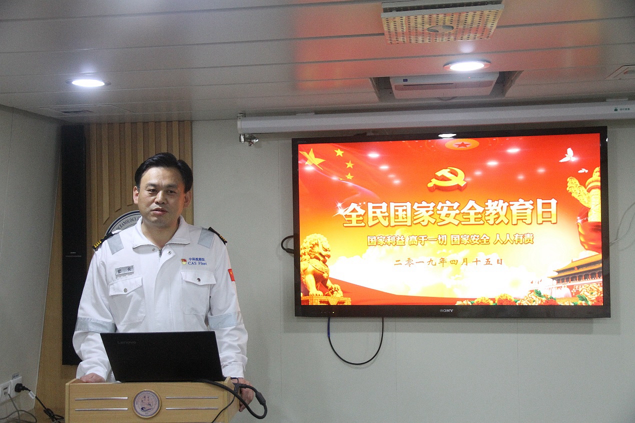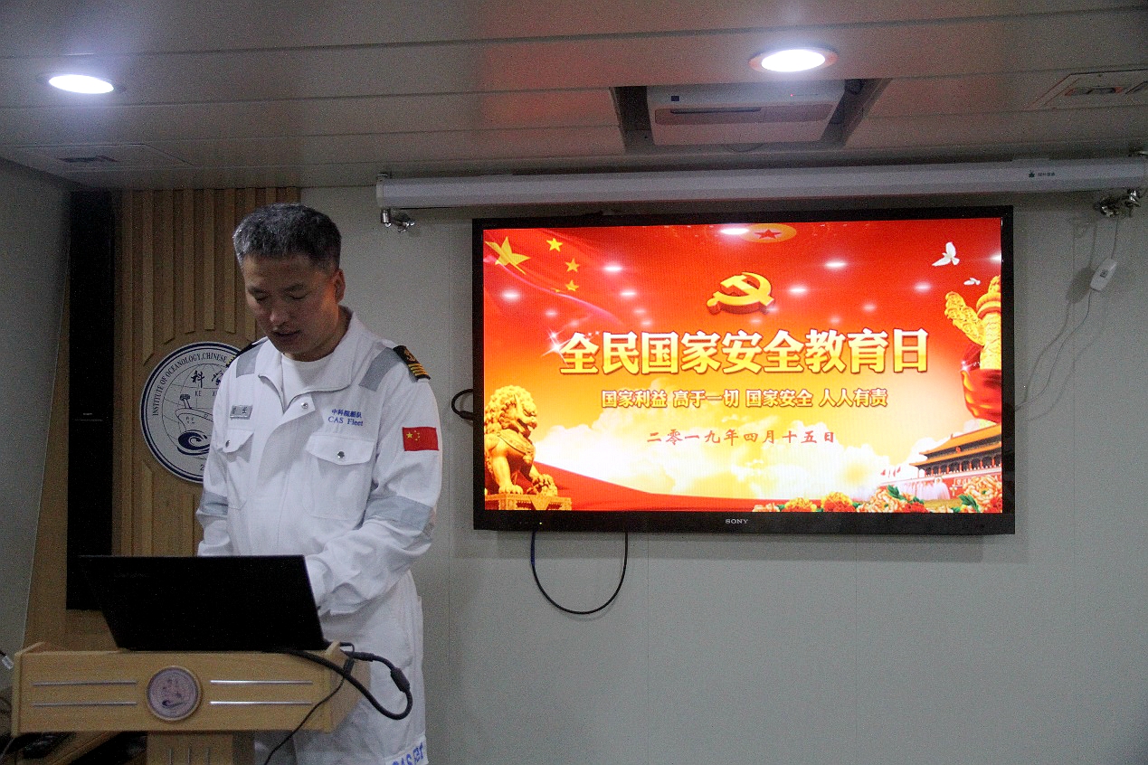安而不忘危,存而不忘亡,治而不忘乱。4月15日,在第四个全民国家安全教育日到来之际,远在太平洋执行科学考察任务的“科学”号利用作业间隙开展“维护国家安全人人有责”为主题的宣传教育活动。党委委员、“海上堡垒”临时党支部书记李雷溪同志以“国家利益高于一切,国家安全人人有责”为题做专题教育讲座。全船除在岗值班人员外全部参加学习活动,船长陈修峰主持活动。