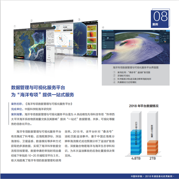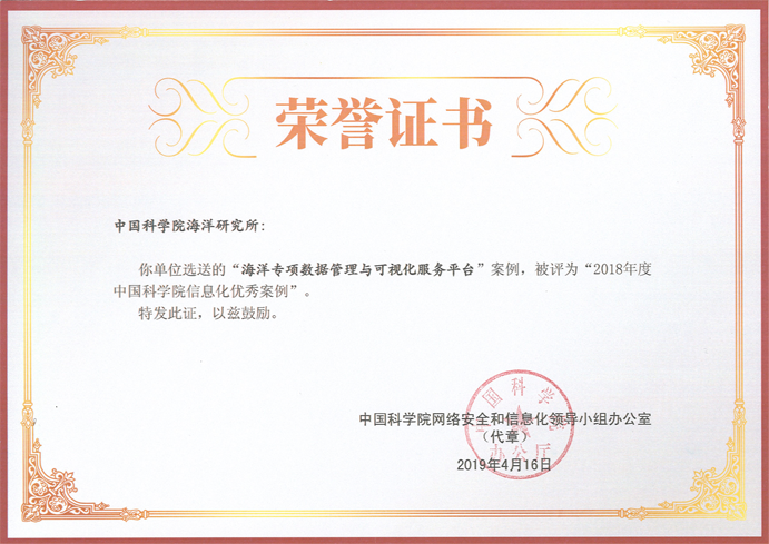 近日,中国科学院在全院范围内开展科研信息化优秀应用案例评选工作,中科院海洋所海洋大数据中心设计研发的“海洋先导专项数据管理与可视化平台”被评为2018年度中国科学院科研信息化优秀案例,并入选《中国科学院信息化年度报告(2018)》 。