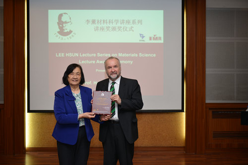 李依依院士为Helmut Clemens教授颁发李薰讲座奖奖牌