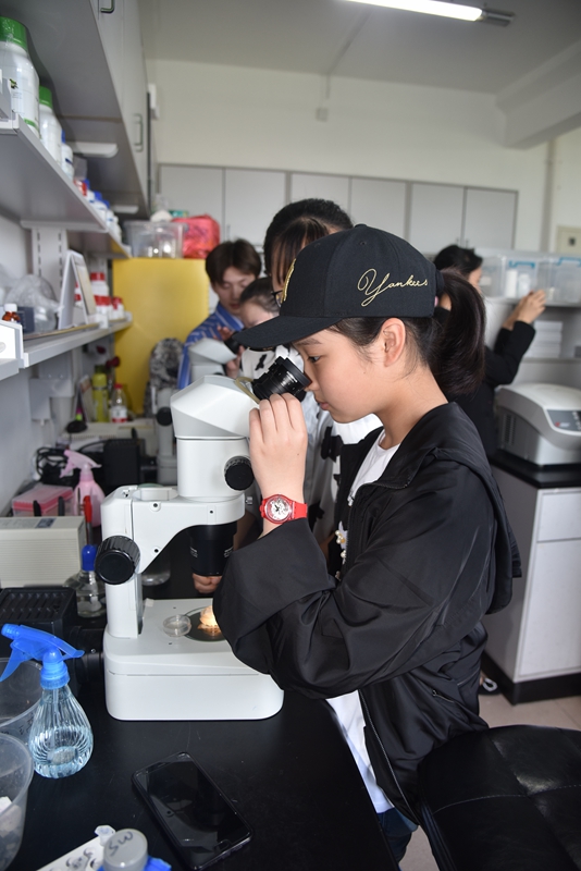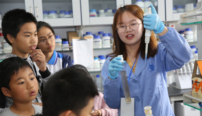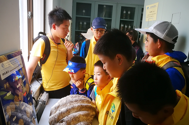 学生观看科研人员做演示实验 郑守仪院士为学生讲解有孔虫科普知识