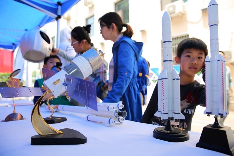 学生观看长征系列运载火箭模型 学生观看水下机器人展示