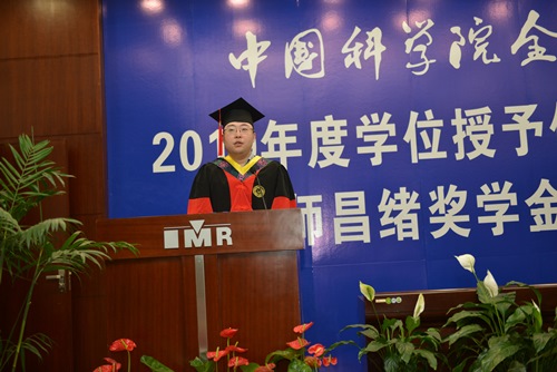 2016级博士生卢正冠同学代表全体毕业生发言。他首先向在学期间提供指导、帮助和关心的老师表示感谢。今年正是建国、建院70周年,卢正冠深情回顾了中国科大的光辉岁月以及自己来所后的心态转变,分享了自己的心路历程和感悟。发言的最后,他以师昌绪先生的话作结,与全体毕业生共勉:人生在世,首先要有一个正确的人生观,要对人类有所贡献。作为一个中国人,就要对中国做出贡献,这是人生的第一要义。
