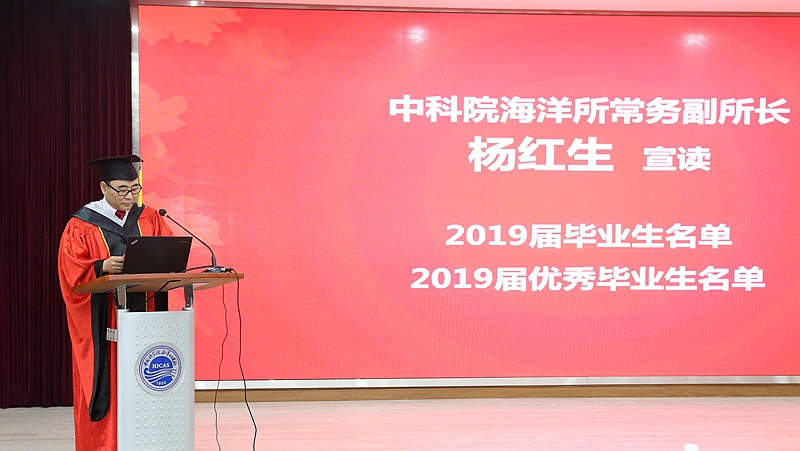典礼在雄壮的国歌声中拉开序幕。杨红生常务副所长宣读了2019年通过毕业答辩的113名学生名单(博士研究生61人、硕士研究生52人),以及获得国家、山东省、中科院及海洋所等各类奖项的优秀毕业生名单,并对他们顺利毕业表示热烈祝贺。