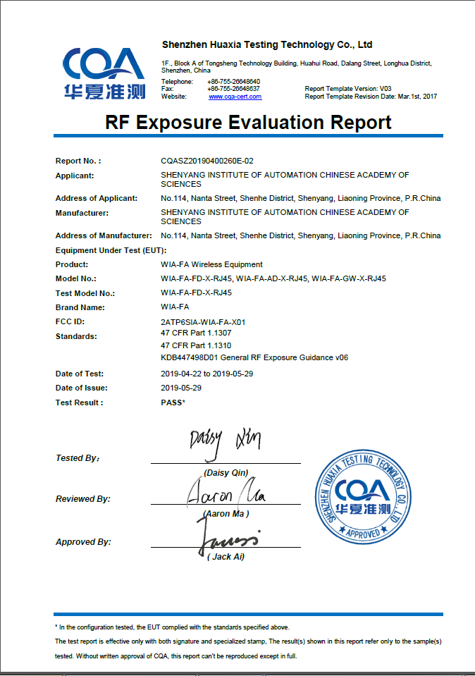 WIA-FA是工业物联网的核心技术,是工厂自动化生产线实现在线可重构的重要使能技术,对推进制造业由传统的低成本大批量生产模式向高端高附加值的个性化生产模式转变,助推制造业的转型升级具有重要意义。此次WIA-FA 产品能够顺利通过FCC认证,证明沈阳自动化所在产品整机设计尤其是电磁兼容设计领域具有足够的知识积累和技术储备,也为WIA-FA产品将来推广美国市场垫定了坚实的技术基础。