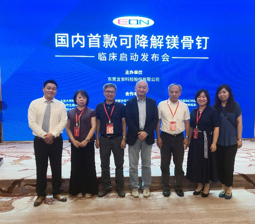 金属镁及其合金由于在人体环境中可发生腐蚀降解,并被人体吸收,因而可以避免临床用钛合金、不锈钢等植入器件的二次手术取出问题,被誉为“革命性的医用金属材料”。中科院金属研究所杨柯研究员团队从2004年开始可降解镁基金属及相关器件的研究开发工作,开发出包括骨折固定器件、心血管支架、界面钉、胃肠吻合钉、骨填充材料等多种可降解镁基金属医疗器械产品,并与国内的相关医疗器械公司合作进行产品的临床转化。近期,以团队为技术支持的东莞宜安科技股份有限公司开发的可降解纯镁骨钉产品获得国家药品监督管理局的临床批件,成为国内第一个获得临床批件的可降解镁基金属III类(植入类)医疗器械产品,意味着我国在该领域中的产品临床转化获得突破性进展。东莞宜安科技股份有限公司于2019年7月19日召开了该产品的临床启动发布会,金属所的杨柯研究员、谭丽丽研究员、杨院生研究员、张炳春研究员等出席了发布会,杨柯研究员代表团队发言。