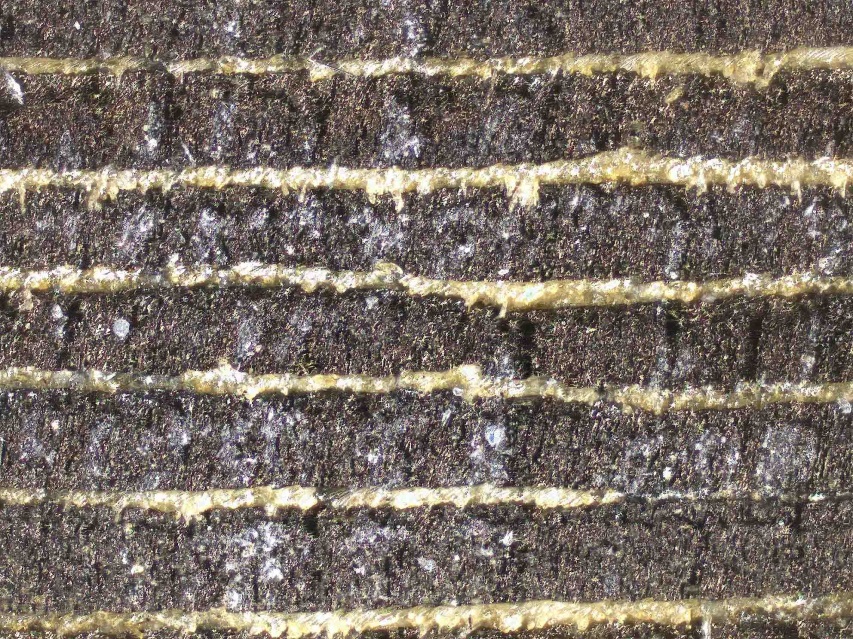 水导激光技术特别适用于难加工材料,比如对厚度4mm的碳纤维复合材料进行切割后,加工区边缘无毛刺,层间纹理清晰(如图1所示),解决了当前碳纤维复合材料常规技术加工后存在毛刺的问题。切割不锈钢材料后,加工区域边缘平直,无重融层和热影响区(如图2所示),解决了当前超快激光加工中的结构锥度问题。