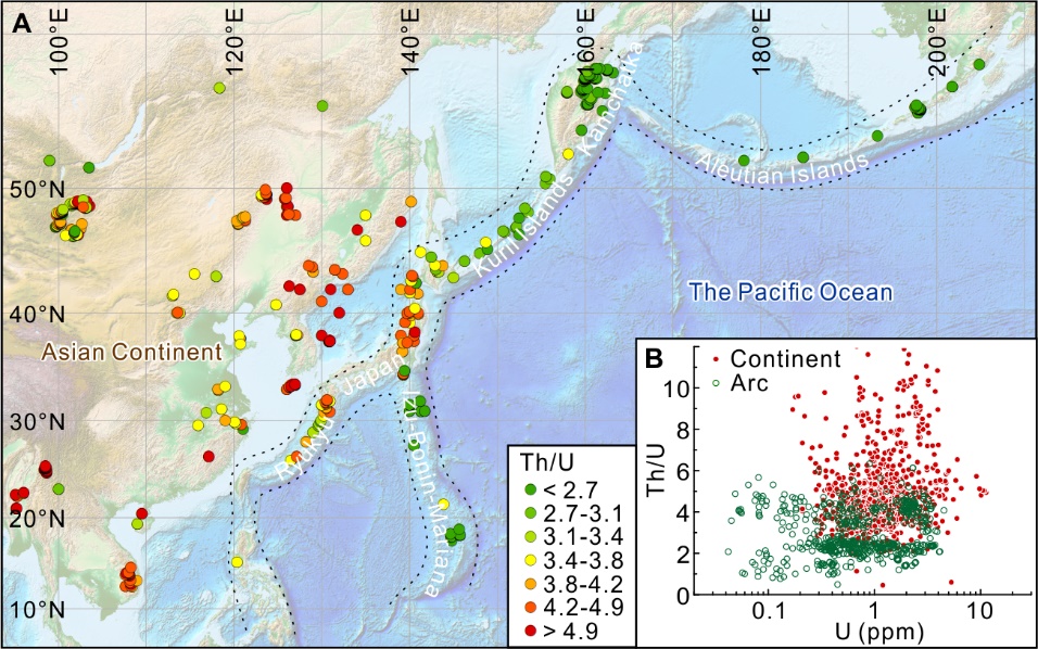 孙卫东研究员指导其博士后刘鹤,联合国外科学家以全新手段和视角对全球性氧化事件的发生时间进行了限定。研究发现,在当今地球上,形成于阿留申群岛、堪察加半岛、千岛岛弧、日本群岛和琉球群岛的弧岩浆岩中Th元素含量和U元素含量的比值(Th/U)明显低于亚洲东部的内陆型岩浆岩。Th和U是地球化学性质十分相近的两种元素,因此不同岩性的岩浆岩中的平均Th/U基本保持一致。弧岩浆岩具有低Th/U的原因是在大气和海水中氧气的氧化作用下,地表河流和海水中的U元素主要以溶于水的U6+形式存在,但Th元素仍以不溶于水的Th4+形式存在,致使现代海水中的U元素含量远高于Th元素含量,从而造成蚀变的海底洋壳具有低Th/U。这些蚀变洋壳在沿俯冲带向深部俯冲过程中,通过洋壳脱水等作用将其低Th/U的特征随着流体运移最终带入到俯冲带上方形成的弧岩浆岩中。