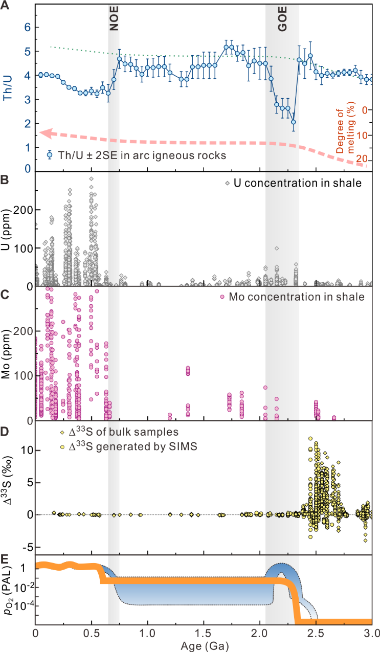 在地球早期大气和海水中均没有氧气的情况下,蚀变洋壳不会具有低Th/U特征,当时板块俯冲作用所形成的弧岩浆岩Th/U也不会降低。基于这一设想,刘鹤等人从全球岩浆岩数据库中筛选了30亿年前至今形成的所有中酸性弧岩浆岩的地球化学数据,以统计学方法计算出全球弧岩浆岩的Th/U随时间的变化规律。结果发现,弧岩浆岩的平均Th/U在地质历史时期的两次大幅度降低刚好记录了大约24亿年前和大约7.5亿年前两次全球性氧化事件的发生。