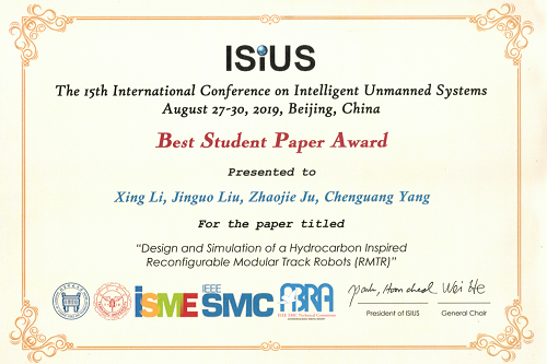 沈阳自动化所空间自动化技术研究室博士生李兴在导师刘金国研究员的指导下,主要从事新型变构型机器人的研究工作。该论文以新概念无人平台为背景,设计了基于仿生可重构原理的履带式模块机器人,理论分析了该机器人系统的构型多样性和环境适应性,并进行了仿真研究。会议期间,李兴在会上作报告介绍了论文的最新工作进展,获得会议组委会的一致好评,最终荣获“最佳学生论文奖”。该研究得到了国家重点研发计划(基金号:2018YFB1304600)、国家自然科学基金(基金号: 51775541)和中国科学院交叉创新团队(基金号:JCTD-2018-11)的资助。